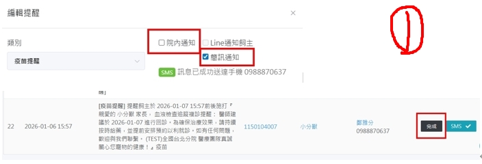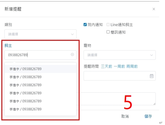 5.「提醒通知」時,要對飼主名下A動物通知,但若有多隻動物,輸入電話時會出現一堆,每隻電話都對應某隻動物,有辦法只輸入電話一次,寵物全部秀出來嗎?還是可以隨便點,之後內文的寵物名稱再自己改?