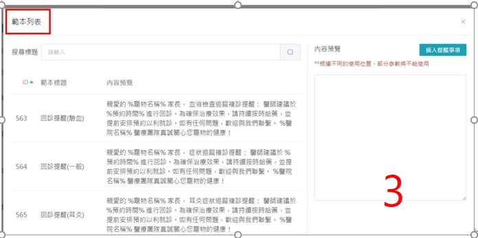 3.傳送訊息的「範本」是否可讓各分院自行調整範本內容,像「住院補費通知(英/中)/回診通知(英)/客訂百貨/匯款帳號/手術禁食水(英)/術前術後通知…..」這些通通沒有。能理解內容可自行增加縮減,但一直複製貼上,會花很多時間找內容,是否可由各分院自訂範本,以後直接選範本即可,不用再自己複製貼上?