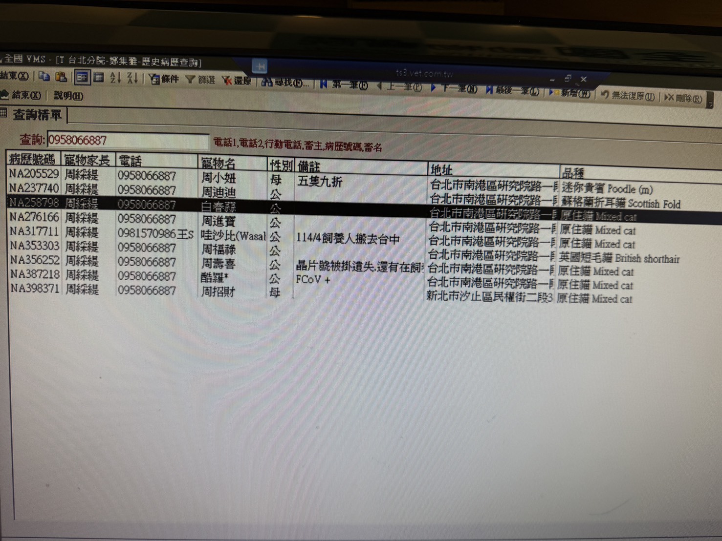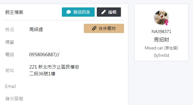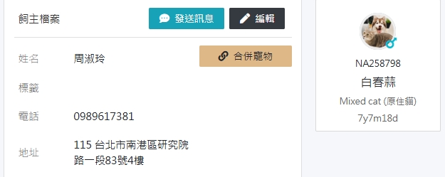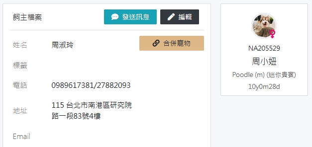 此主人已改名及更換電話且名下多隻寵物(見獸醫大師截圖)