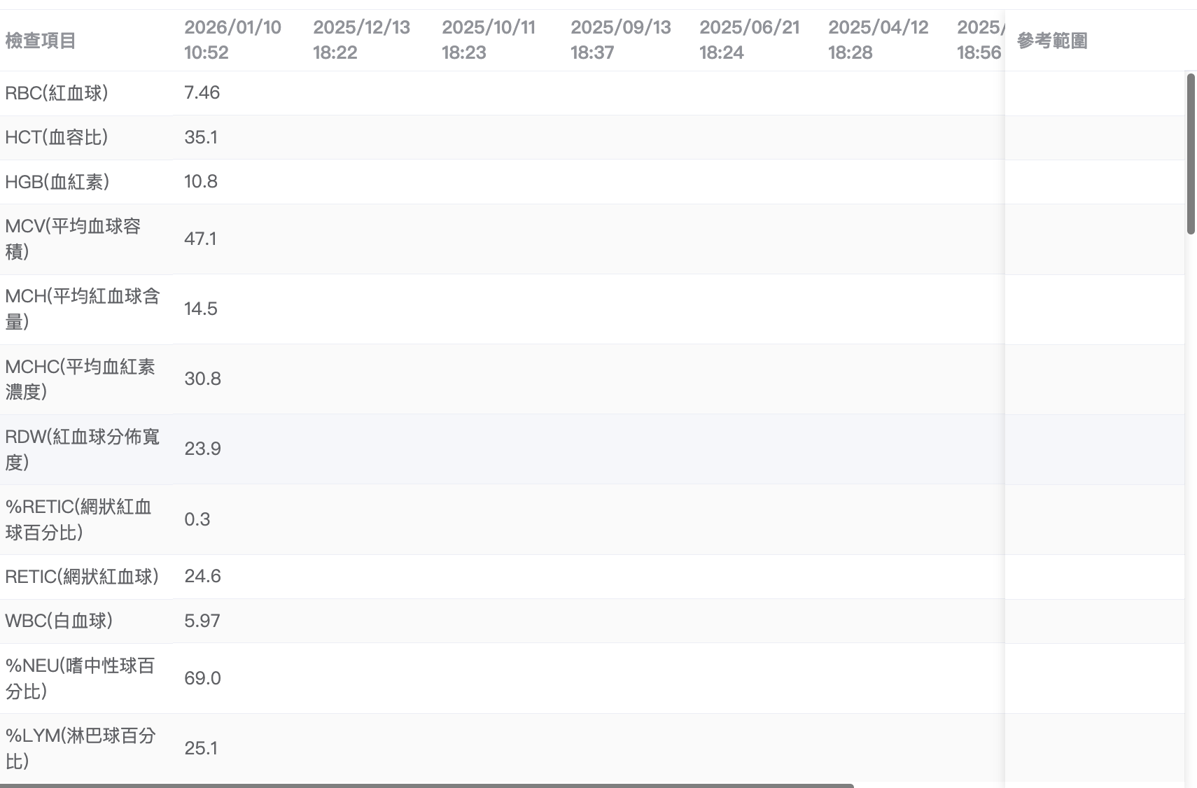 因為匯入的病歷資料沒有包含物種和品種資訊,造成在檢驗時發送給IDEXX的物種資訊變成「其他」,沒辦法顯示參考值範圍。