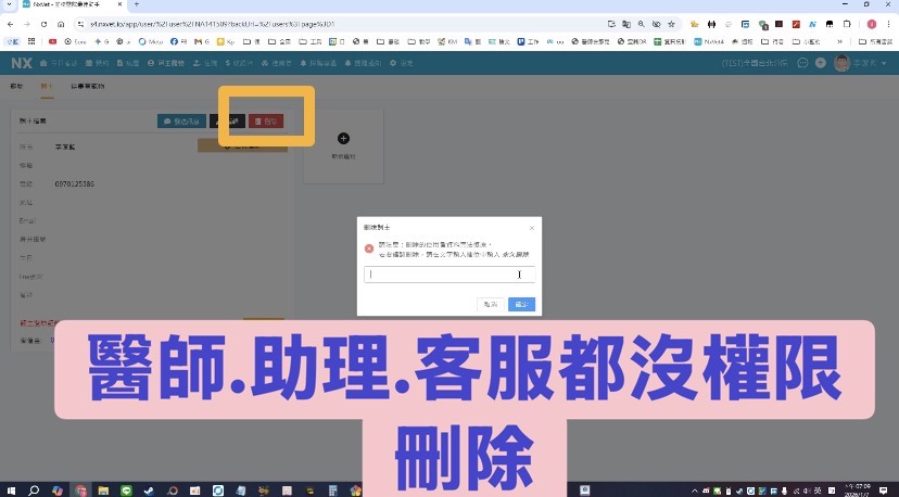 今天遇到需要合併資料,照著教學影片做,但是合併的空白資料,沒有「刪除」鍵可以選擇,使用醫師、助理、客服帳號登都沒有權限。