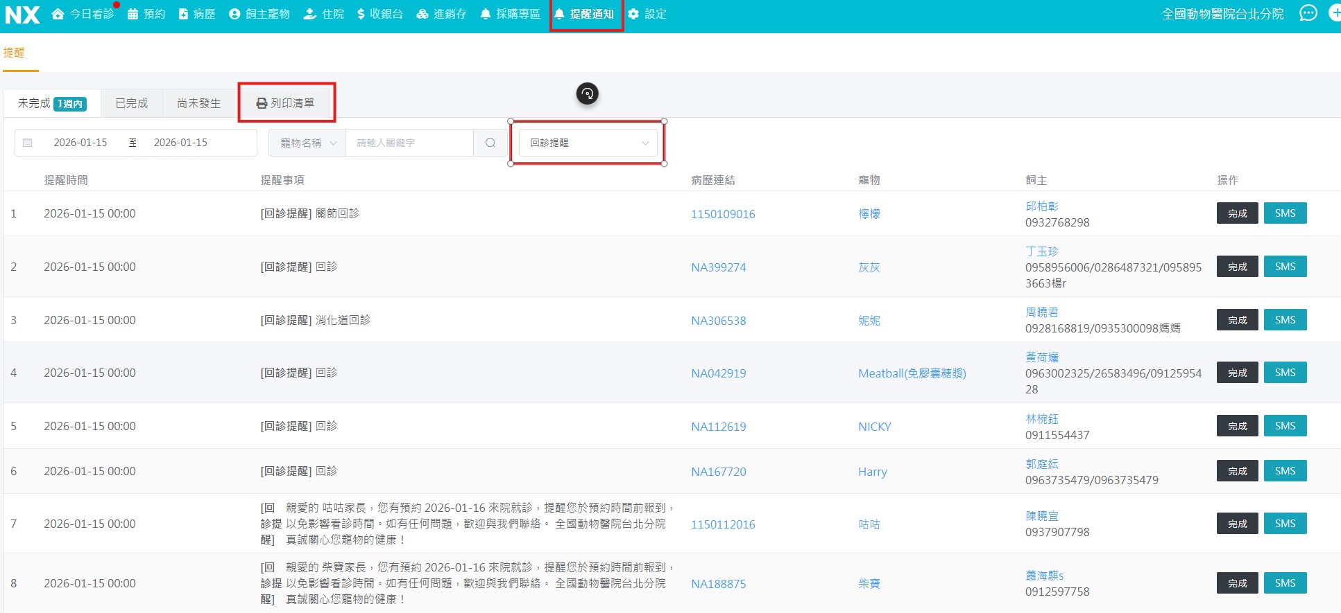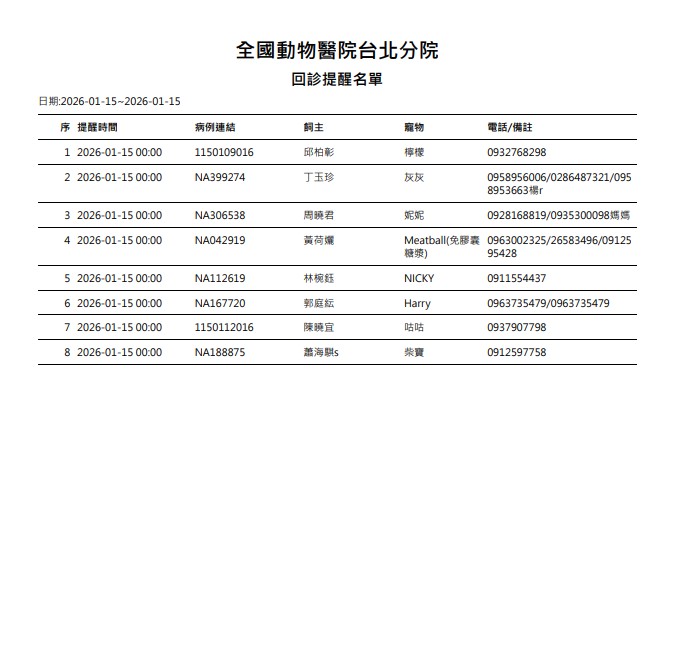 回診提醒: 病歷號、動物名、飼主名、聯絡電話、提醒主訴 、 主治醫師